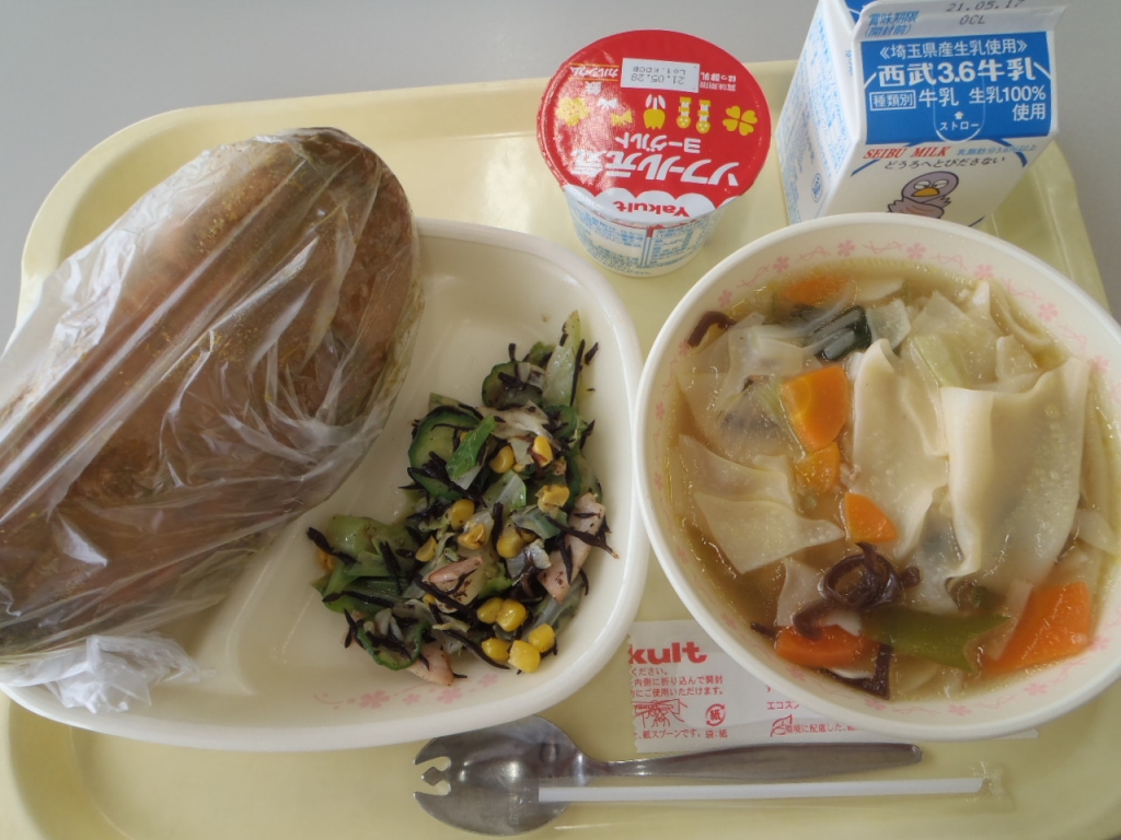 牛乳 ヒジキ入りサラダ わんたんスープ