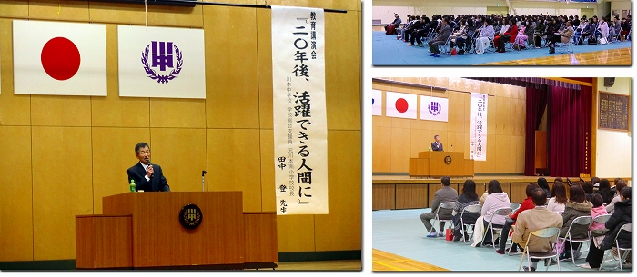 参観の後は、本校の学校総合支援員の田中登先生による、教育講演会が体育館で行われました。 『二十年後、活躍できる人間に』という、テーマで、お話してくださいました。 会場には200人近くの保護者の方がお集まりくださいました。