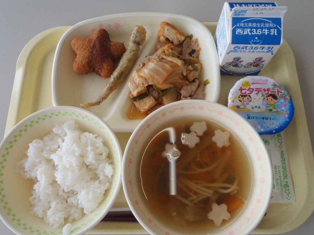 ⭐︎牛乳 ⭐︎ご飯・ふりかけのり ⭐︎さばのしょうが焼き ⭐︎切り干し大根の炒り煮 ⭐︎重忠汁 今日は重忠汁です。 重忠汁は深谷市の郷土料理で、重忠公が幼いころに、うぐいすの瀬というところで、石投げをして遊んでいたことから、白玉団子を石に見立てています。