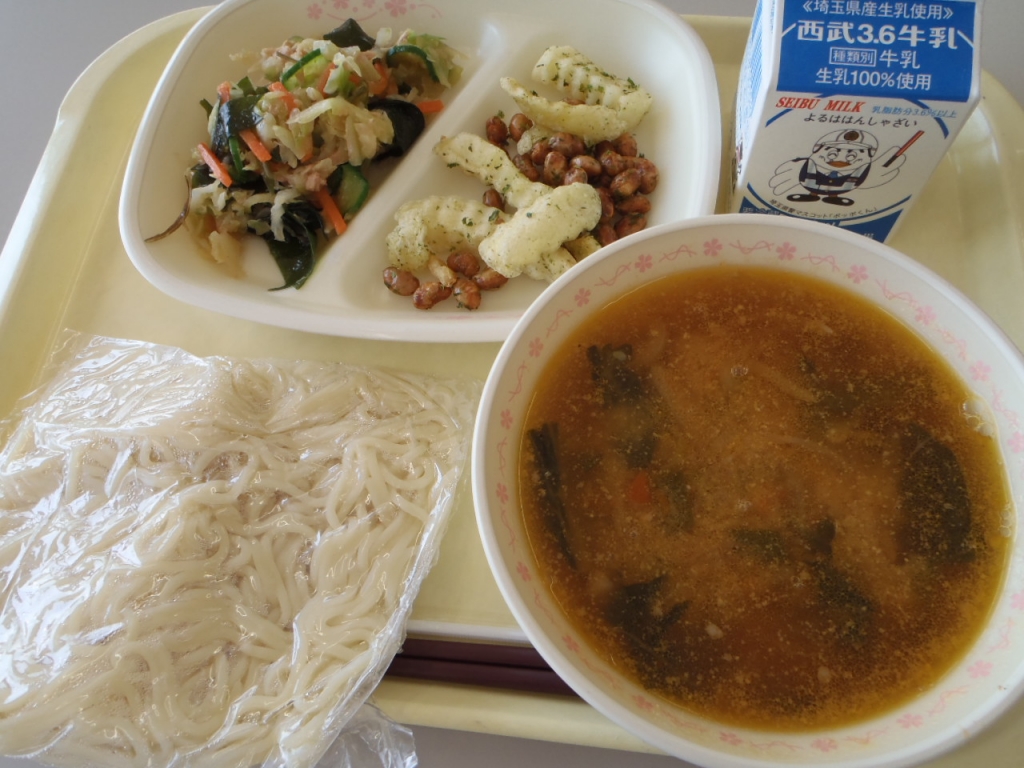 ⭐︎牛乳 ⭐︎ご飯・ふりかけのり ⭐︎さばのしょうが焼き ⭐︎切り干し大根の炒り煮 ⭐︎重忠汁 今日は重忠汁です。 重忠汁は深谷市の郷土料理で、重忠公が幼いころに、うぐいすの瀬というところで、石投げをして遊んでいたことから、白玉団子を石に見立てています。