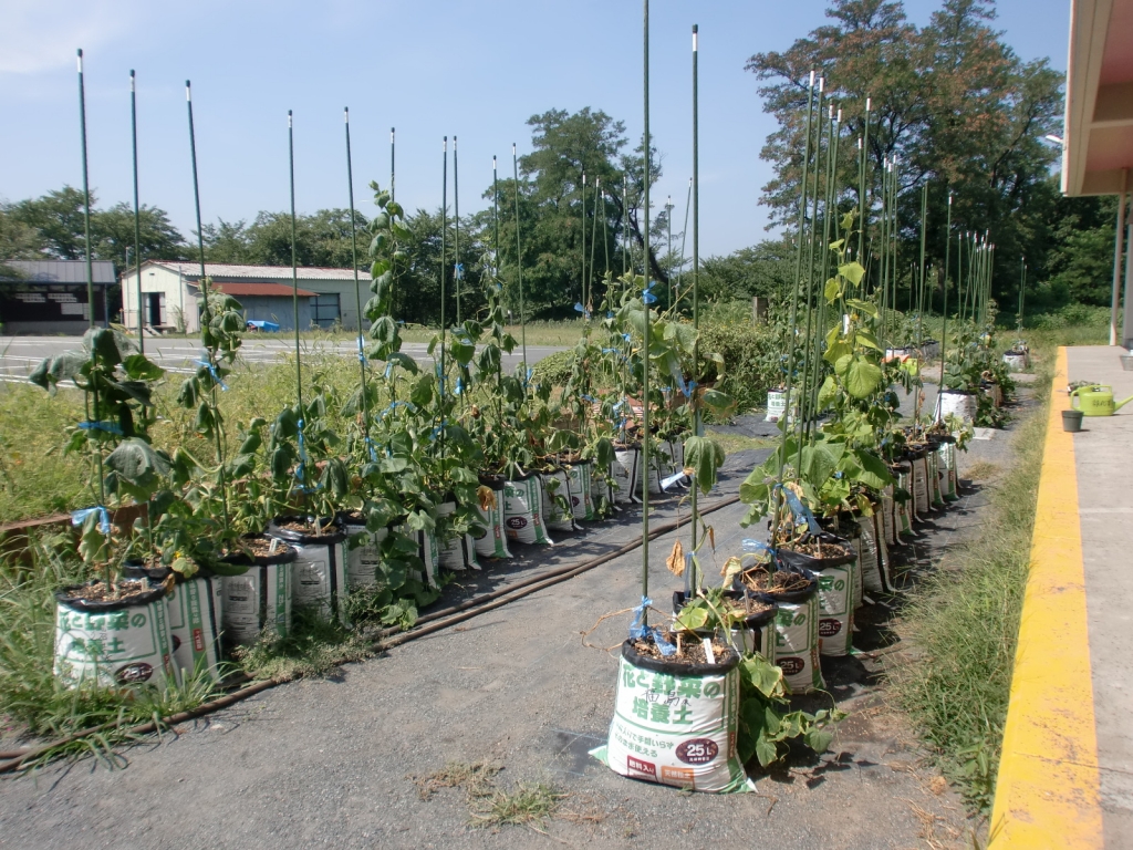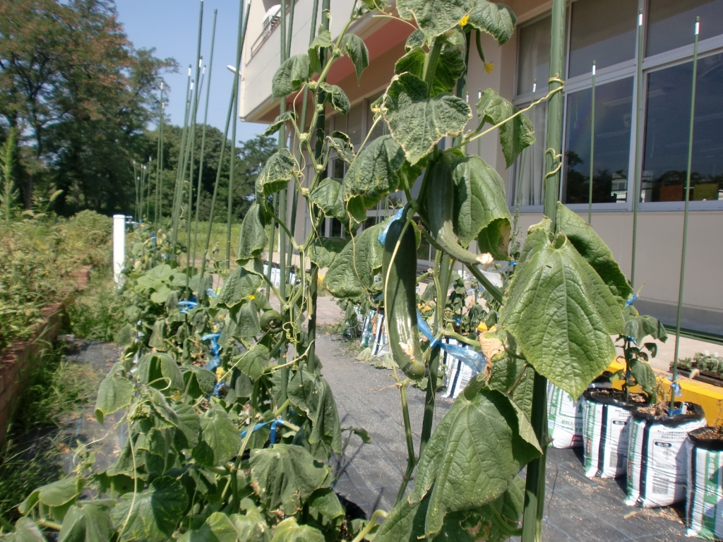 技術室の前に,袋栽培で野菜がつくられています。技術・家庭科の授業で行っている植物栽培の一場面です。袋に近づいていくと,見覚えのある葉をしています。シャキシャキとした歯ごたえ,冷たくして塩を軽くすり込んで食べてもおいしい野菜です。そうです!この野菜は,胡瓜(きゅうり)です。実を付けているものが見られます。これから収穫の時期が楽しみですね。