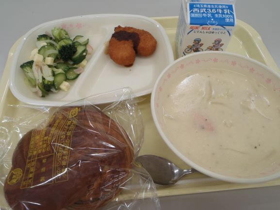 ⭐︎牛乳 ⭐︎ご飯 ⭐︎ホルモン揚げ ⭐︎上州サラダ ⭐︎こしね汁 今日は群馬県富岡市と深谷市の友好関係を記念した給食、「お富ちゃん給食」です。 富岡市には、世界遺産の富岡製糸場があります。渋沢栄一翁も富岡製糸場の設立に貢献しました。ホルモン揚げは...