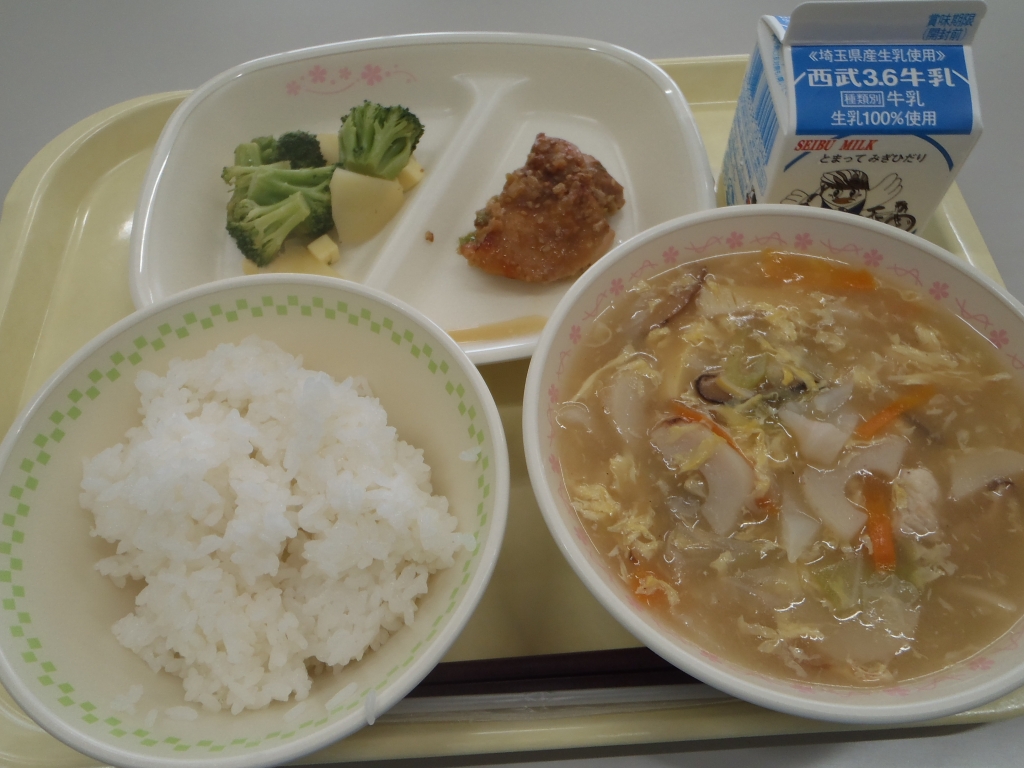 今日の給食は、もやしラーメン、手作り豆腐ドーナツ、チョレギ風サラダでした。 チョレギ風サラダは、ちりめんじゃこやのりが良いアクセントとなっていました。豆腐ドーナツも、中はサクサク、外はカリカリでとてもおいしかったです(^^)