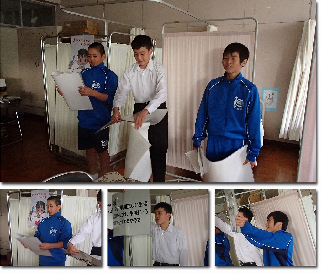 今週の土曜日のスキー教室説明会で、保健委員会男子の発表があります。それに向けて練習中です。みなさんが無事に行ってこられるよう、健康観察の話をしますので、しっかりと聞いてほしいと思います。