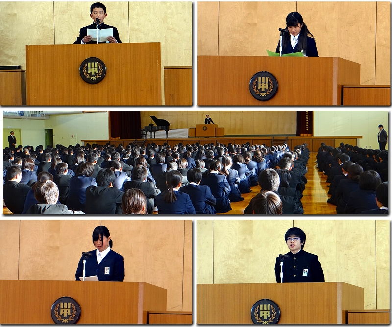 本日より3学期が始まりました。新年を迎え、引き締まった表情の生徒たちが多く見られました。始業式では生徒会代表と各学年担当が新年の抱負・誓いを発表してくれました。3年生は受験(検)も間もなく始まり、中学校生活最後の学期となります。目標を達成できるような有意義な学期にしていきましょう。