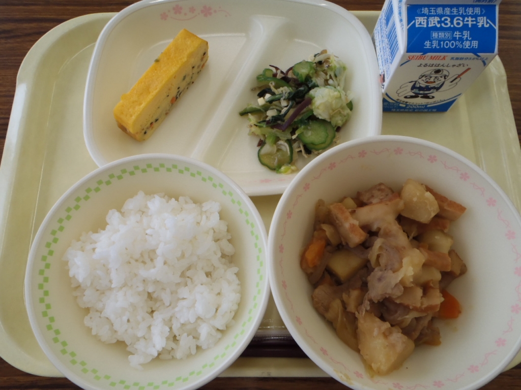⭐︎牛乳 ⭐︎ご飯・ふりかけのり ⭐︎さばのしょうが焼き ⭐︎切り干し大根の炒り煮 ⭐︎重忠汁 今日は重忠汁です。 重忠汁は深谷市の郷土料理で、重忠公が幼いころに、うぐいすの瀬というところで、石投げをして遊んでいたことから、白玉団子を石に見立てています。