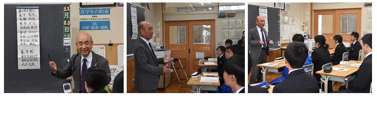 夢こころざし講演会を開催し、講師に藤田雄山貞資先生顕彰会の会長である大澤誠一先生をお招きしました。3年生たちに向けて、雄山の生き方から夢や志を持つことの大切さ、そして川本の将来について熱いお話をいただきました。