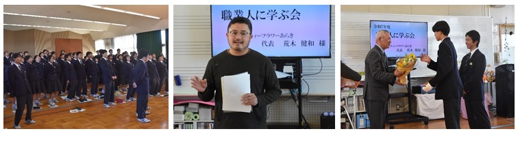 職業人に学ぶ会を開催し、講師に荒木健和さんと田村明義さんをお迎えしました。社会体験チャレンジを目前に控えた2年生に仕事をすることの大切さなどをお話いただきました。
