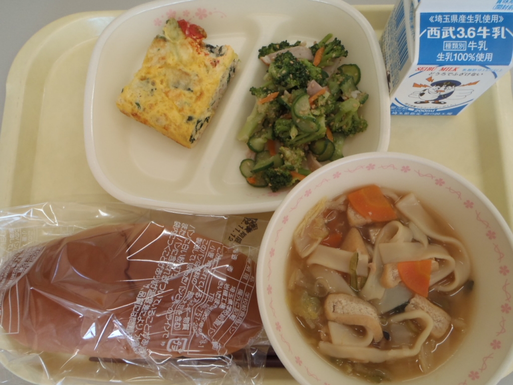 今日の給食は、マーボーラーメン、深谷レンガパンケーキ、春雨サラダでした。 マーボーラーメンは少し辛めのとろとろしたスープで、麺との相性も良く、とてもおいしかったです!(^^)!