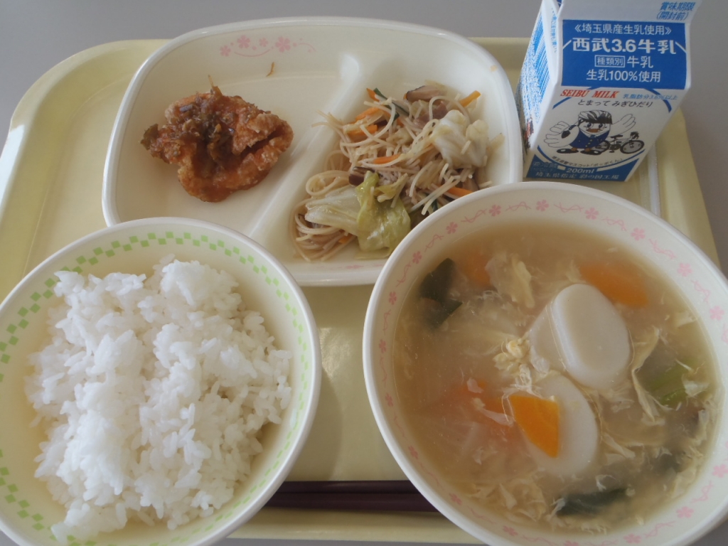 今日の給食は、マーボーラーメン、深谷レンガパンケーキ、春雨サラダでした。 マーボーラーメンは少し辛めのとろとろしたスープで、麺との相性も良く、とてもおいしかったです!(^^)!