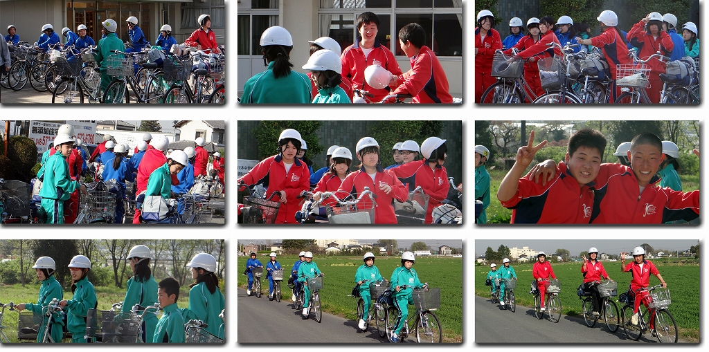 地区別集会のねらいは、上級生が新入生に通学路の確認をさせたり、通学路の危険な箇所を教えたり。また、3.11のような大きな地震の時に備えて、地区ごとに生徒を下校させたりするためのものでもあります。地区長、副地区長を決めた後、校門付近に自転車を持って集合させ、まずは、自転車点検を実施し、その後、地区ごとに先生方も一緒に一斉下校です。上の写真は、そのときの様子です。