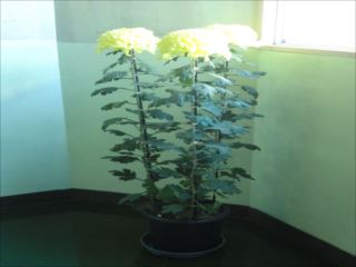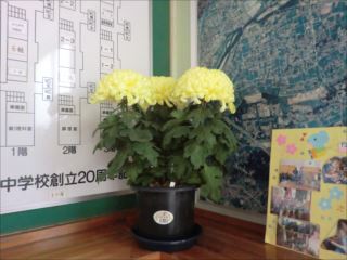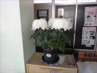 そこで目を引くのが、大輪の菊「三本仕立て」です。その菊が、本校にも飾ら