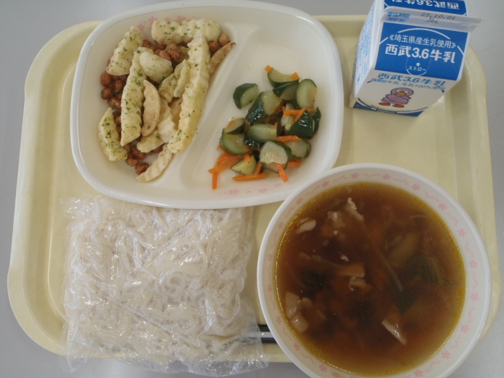 ⭐︎牛乳 ⭐︎きつねうどん ⭐︎マーラーカオ ⭐︎小松菜とじゃこの炒り煮