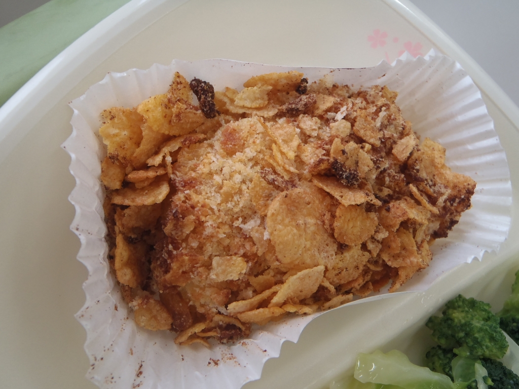 チキンのフレーク焼きは、周りのコーンフレークとパン粉がサクサクで中のお肉は柔らかくておいしかったですね。マヨネーズと粉チーズの塩味が絶妙でした!