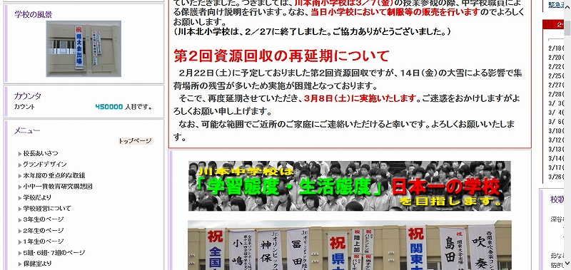 昨日23時40分頃、川本中学校のホームページへのアクセスが450000を突破しました。