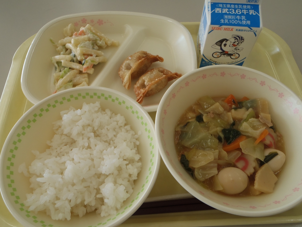 ⭐︎牛乳 ⭐︎ご飯 ⭐︎ホルモン揚げ ⭐︎上州サラダ ⭐︎こしね汁 今日は群馬県富岡市と深谷市の友好関係を記念した給食、「お富ちゃん給食」です。 富岡市には、世界遺産の富岡製糸場があります。渋沢栄一翁も富岡製糸場の設立に貢献しました。ホルモン揚げは...