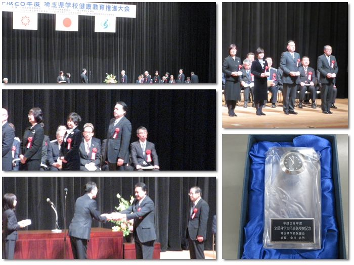 1月27日(金)、さいたま市文化センターにおいて、埼玉県学校健康教育推進大会が行われました。その際、今年度文部科学大臣表彰を受けた川本中が、埼玉県学校保健会より記念品を授与していただきました。