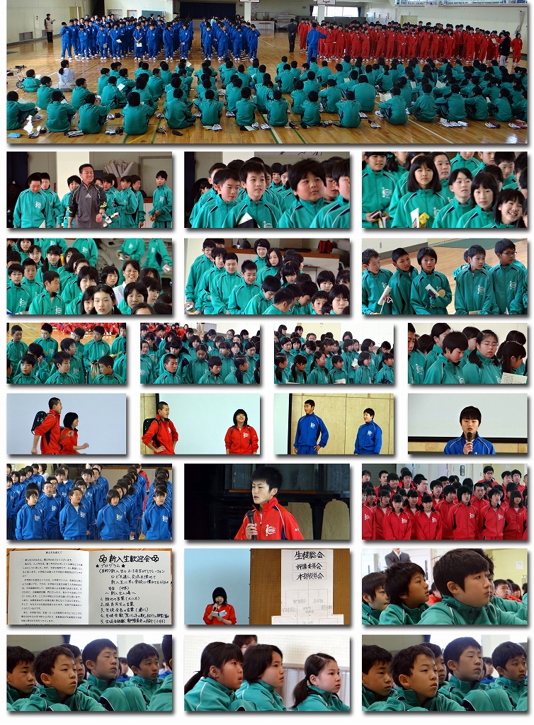 校長先生の歓迎の言葉、生徒会長の話、荒川っ子の歌の紹介、生徒会専門委員会組織の説明、そして、パワーポイントによる川本中の1年の紹介を終えて、レクレーションに入ると、緊張した表情も2・3年生のやさしい言葉がけで、すっかり笑顔を取り戻し上級生たちとも打ち解けあっていました。