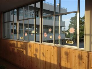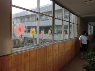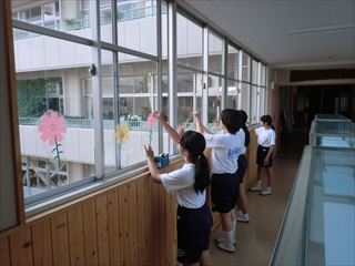 管理棟と教室棟を結ぶ廊下の窓に、美術部のみなさん