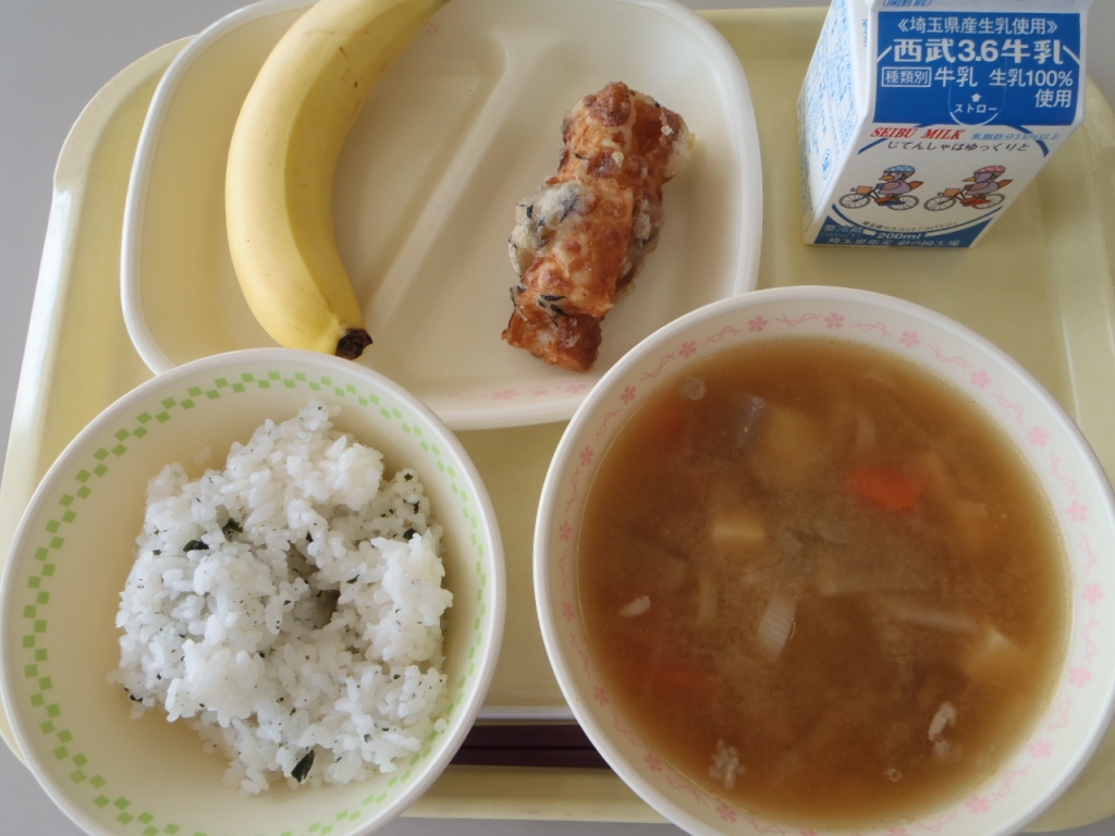 今日の給食は、ご飯、三食そぼろ、ししゃもフリッター、キム豚汁でした。 キム豚汁は、キムチのピリ辛の味がアクセントとなっており、具だくさんでとてもおいしかったです!!