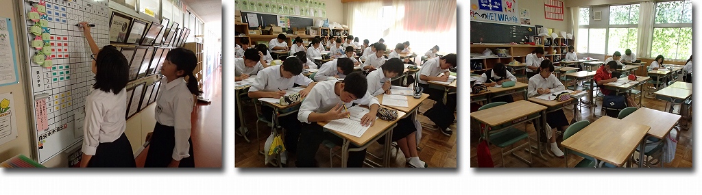 学校では、3年生と残った1.2年生が課題等に取り組んでいます。学校からみんなで応援していますので、運動部の皆さん頑張ってください!