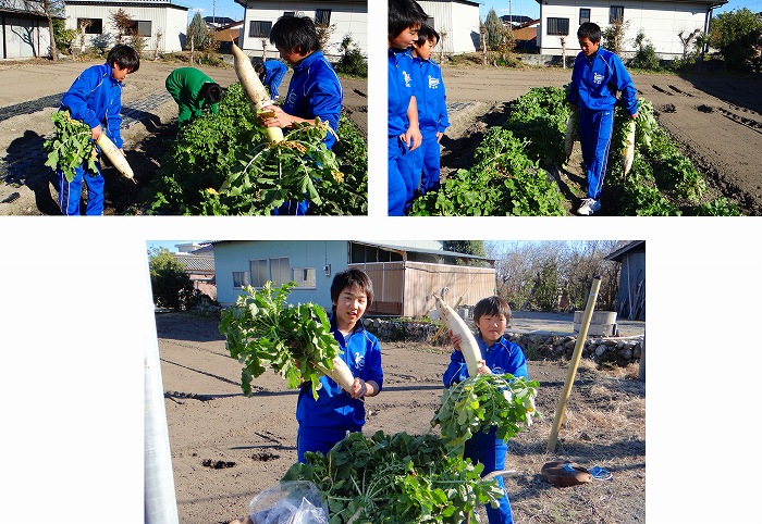 今日の昼休みに、明日の給食の豚汁で使われる、大根を堀りに学校の畑に行きました。有志の4名が手伝ってくれました。合計9本の大根が収穫できました。 一番大きな大根は2㎏もありました。 明日の豚汁が早く食べたいですね。