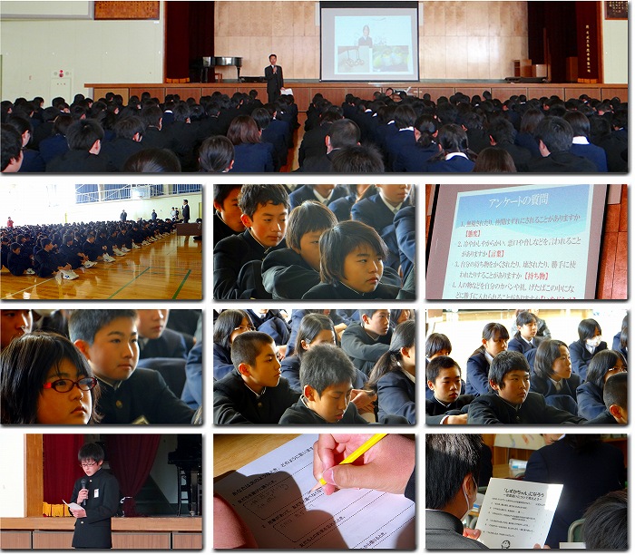 今日から金曜日まで、後期人権週間です。 全校で、校長先生の講話、吉田先生からのいじめについてのアンケート結果と分析を聞きました。 校長先生からは金子みすずさんの、心に響く詩を紹介されました。 吉田先生からは いじめをなくすために、3つの大事なことを話して頂きました。 いじめ、差別に気付く目、 いじめ、差別を許さない心、 いじめ、差別に負けない心 です。 全員、真剣な顔で聞いていました。 集会の後は各教室でまとめをしました。 しっかり書けていました。
