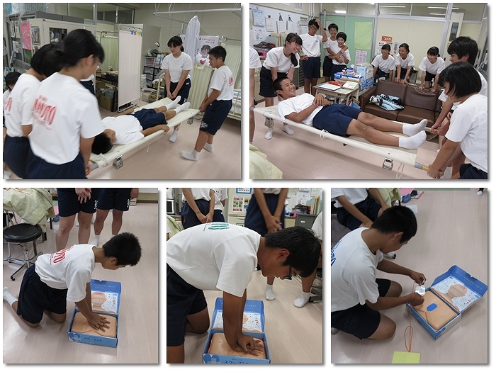 今日は体育祭の係会議が行われ、救護係は活動内容の確認と担架の使用方法の練習を行いました。また、少しですが胸骨圧迫の練習を模型を使って行いました。体育祭が近づいていますが、安全に競技に参加して大きなケガがないようにしてほしいと思います。