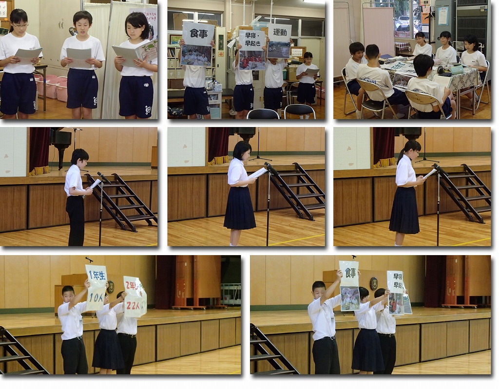 終業式後、連絡として1年生保健委員のみなさんが、夏休み中に注意してほしいことや、お願いについて発表しました。少ない練習期間でしたが、1年生全員が一丸となって自主的に練習に取り組み、当日は自信を持って発表することができました。ありがとうございました。