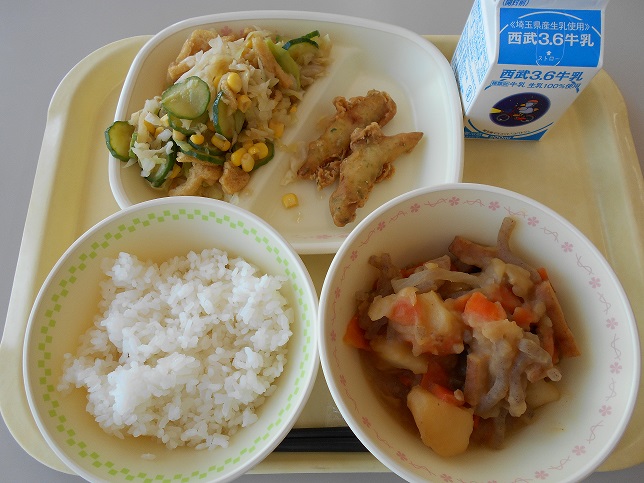 ⭐︎牛乳 ⭐︎小江戸カレー ⭐︎大豆のカリカリ揚げ ⭐︎ハムと大根のサラダ 今日の北小で炊いたご飯は新米です。みずみずしく、モチモチした食感でした。 小江戸カレーは、川越市の特産物でもあるさつまいもが入ったカレーです。 川越市は、古い街並みや武家屋...