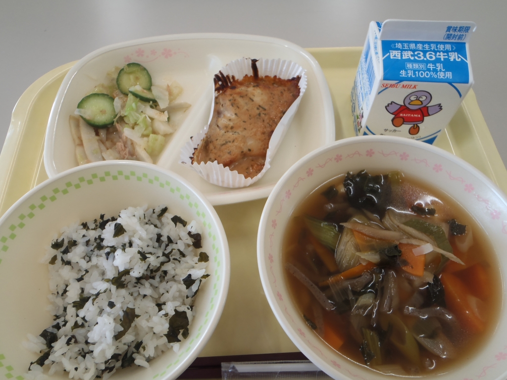 今日の給食は、もやしラーメン、手作り豆腐ドーナツ、チョレギ風サラダでした。 チョレギ風サラダは、ちりめんじゃこやのりが良いアクセントとなっていました。豆腐ドーナツも、中はサクサク、外はカリカリでとてもおいしかったです(^^)