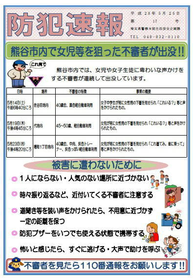 今回の速報は、熊谷市内で発生している不審者についてです。