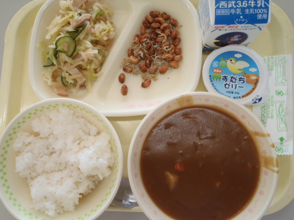 今日の給食は、ご飯、三食そぼろ、ししゃもフリッター、キム豚汁でした。 キム豚汁は、キムチのピリ辛の味がアクセントとなっており、具だくさんでとてもおいしかったです!!