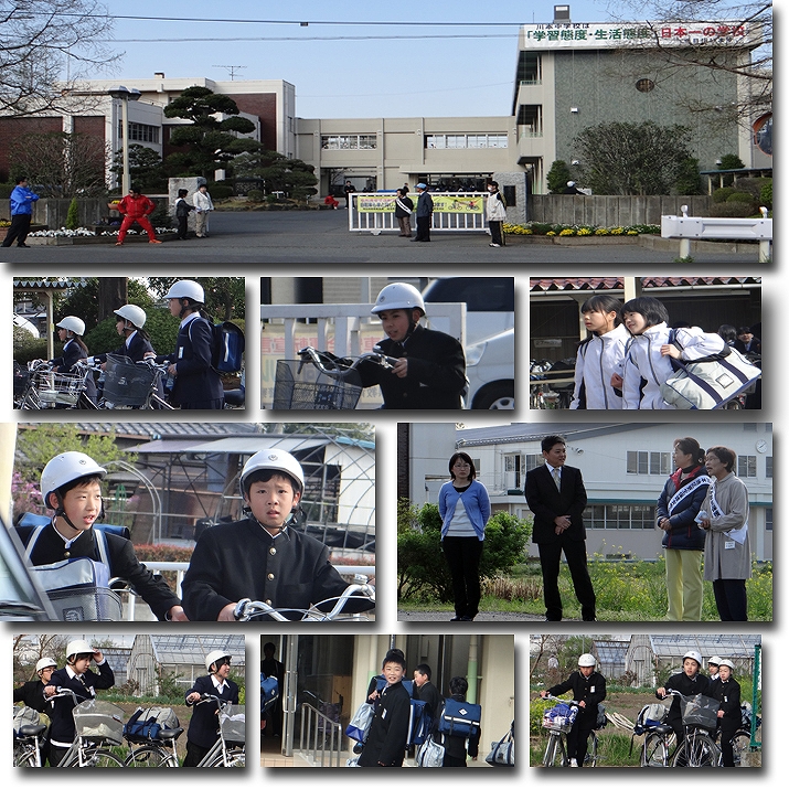 制服姿の新入生の顔は、笑顔の子もいれば、やや緊張気味の子もいました。登校してまずやることは、自分のクラスの駐輪場を見つけることです。先生方が駐輪場や校門に立ち、さらには、川本更生保護女性会の方々の応援もあり、とても明るい雰囲気で朝の登校を見守ることができました。