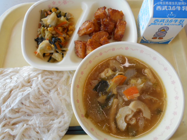 今日の給食は、ごはん、ヤンニョムチキン、チョレギ風サラダ、サルグクスでした。 サルグクスとは韓国のスープで、さっぱりとした優しい味のほっこりスープでした。ヤンニョムチキンはおいしい甘辛味で、ご飯がよく進みました!(^^)!チョレギサ...