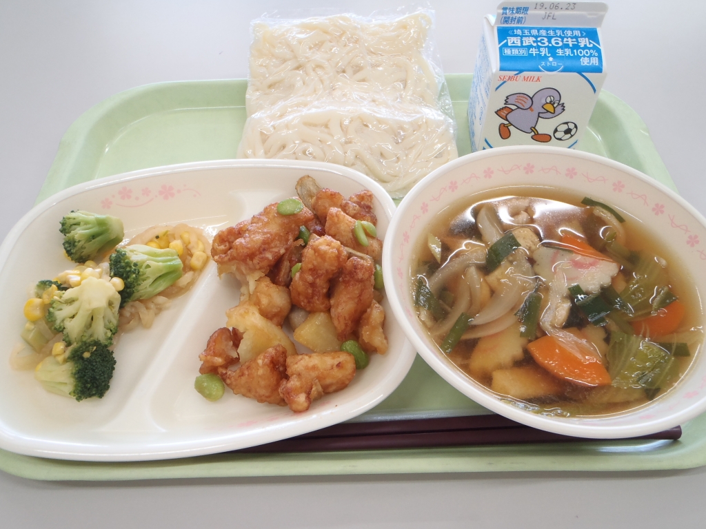 今日の給食は、もやしラーメン、手作り豆腐ドーナツ、チョレギ風サラダでした。 チョレギ風サラダは、ちりめんじゃこやのりが良いアクセントとなっていました。豆腐ドーナツも、中はサクサク、外はカリカリでとてもおいしかったです(^^)
