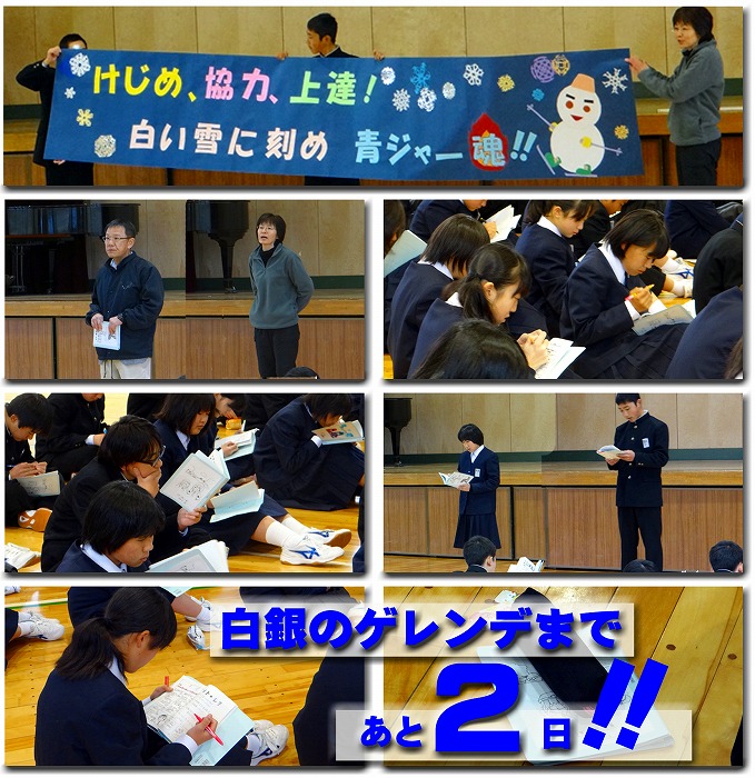 本日は学年朝会が行われました。 1年生はスキー教室までいよいよあと二日です。 実行委員から最終確認のしおりの読み合わせや、先生の話がありました。 そして素晴らしいスローガンの横断幕がお披露目されました。 あと二日!! 楽しみですね。
