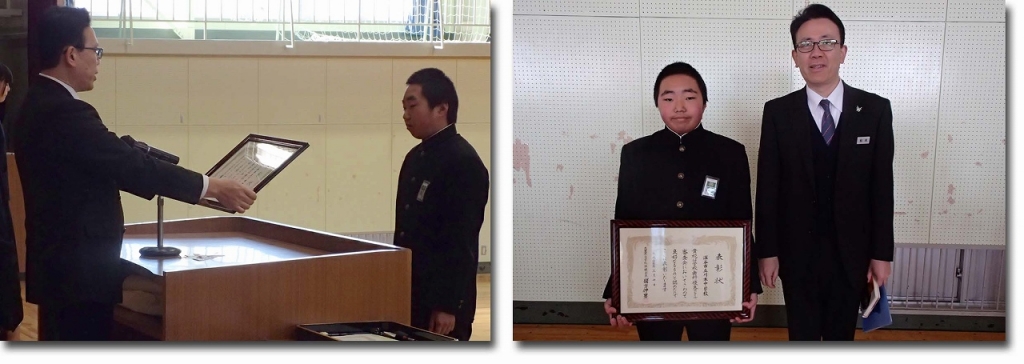 埼玉県学校歯科保健コンクール、大里深谷地区審査会で川本中学校は優良校として表彰されました。代表として、保健委員に表彰をしていただきました。