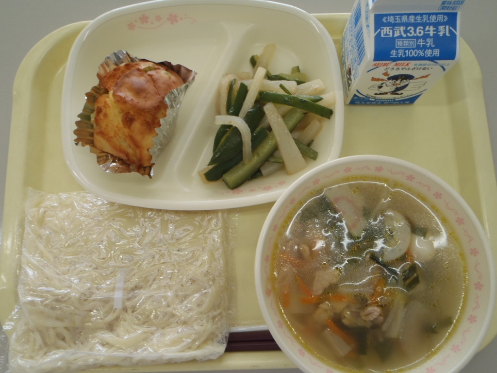 今日の給食は、ご飯、コーンシュウマイ、豚肉とブロッコリーのオイスターソース炒め、ワンタンスープでした。 今日はとても寒かったので、温かいワンタンスープが体にしみてとてもおいしかったです(^^)