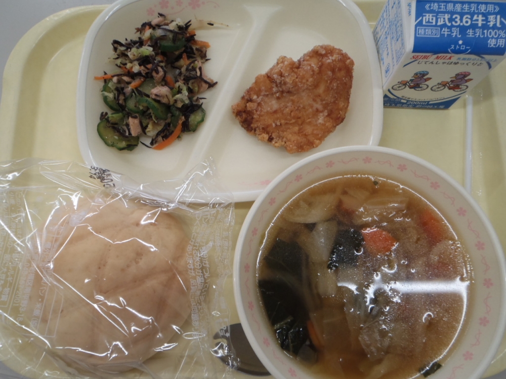 今日の給食は、ご飯、三食そぼろ、ししゃもフリッター、キム豚汁でした。 キム豚汁は、キムチのピリ辛の味がアクセントとなっており、具だくさんでとてもおいしかったです!!