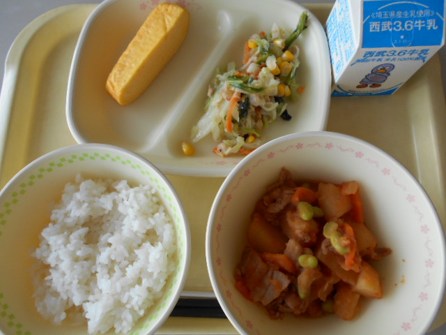 今日の給食は、コッペパン、イチゴジャム、カレーシチュー、ちくわの磯部あげ、バナナでした。 カレーシチューは普通のカレーライスとは違い、さらっとしたシチューがとてもおいししく、パンとよく合っていました!子どもたちは、久しぶりのジャム...