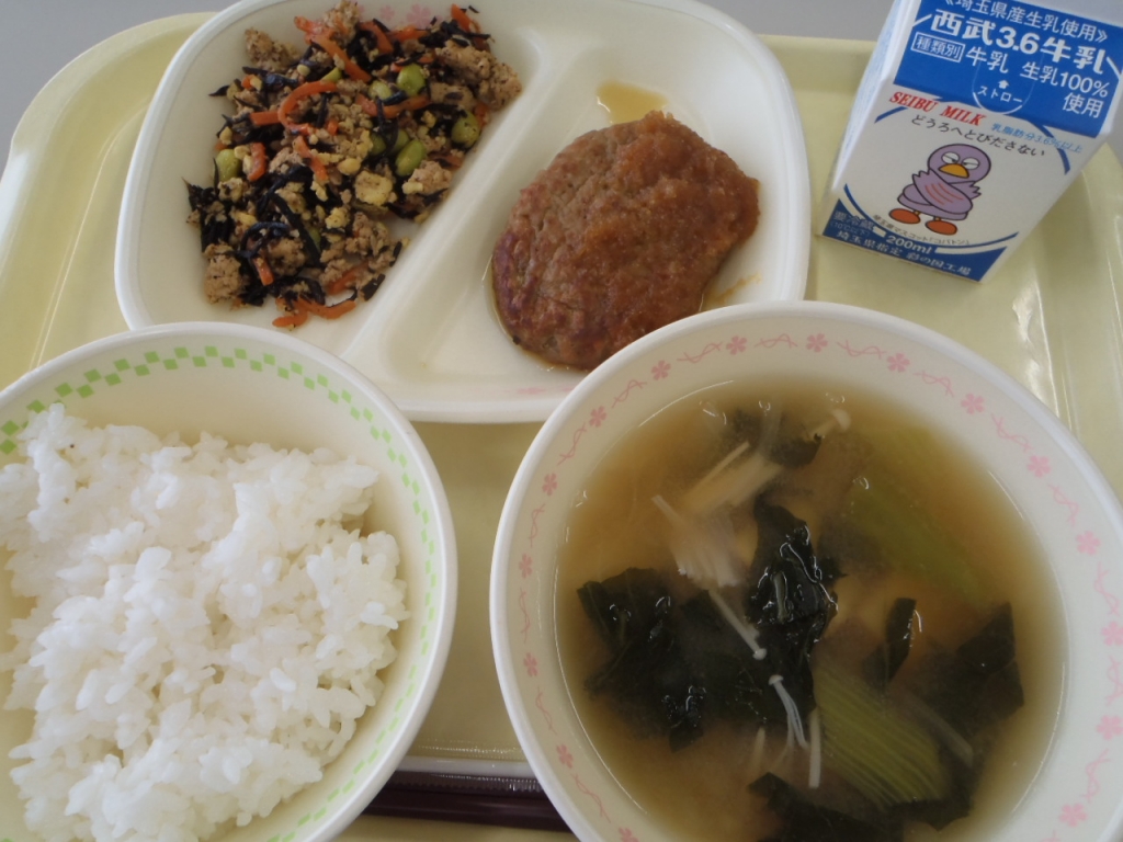今日の給食は、ご飯、三食そぼろ、ししゃもフリッター、キム豚汁でした。 キム豚汁は、キムチのピリ辛の味がアクセントとなっており、具だくさんでとてもおいしかったです!!