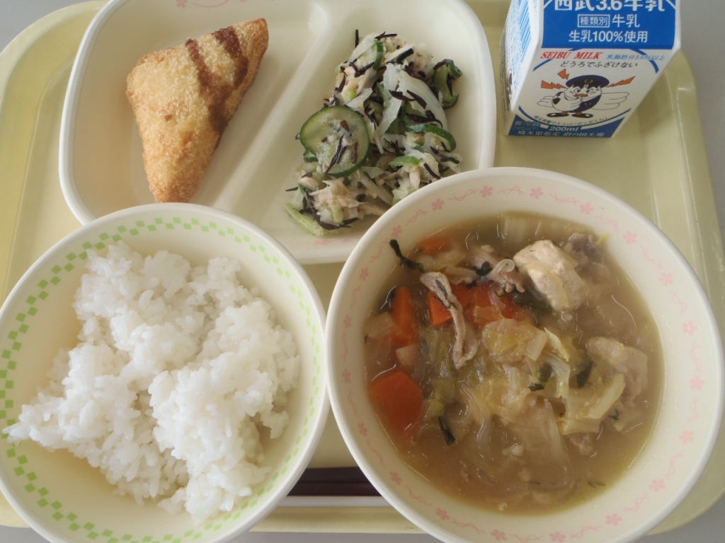 今日の給食は、ご飯、三食そぼろ、ししゃもフリッター、キム豚汁でした。 キム豚汁は、キムチのピリ辛の味がアクセントとなっており、具だくさんでとてもおいしかったです!!