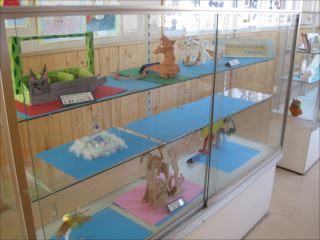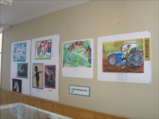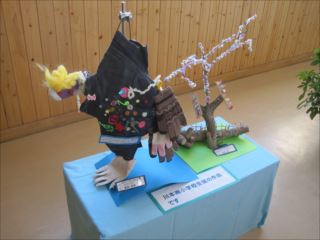 本校では、川本南小学校の児童作品が中央廊下に展示されてい