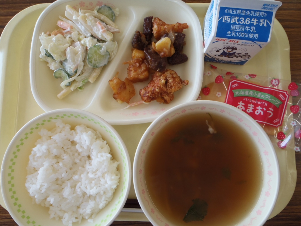 今日の給食は、マーボーラーメン、深谷レンガパンケーキ、春雨サラダでした。 マーボーラーメンは少し辛めのとろとろしたスープで、麺との相性も良く、とてもおいしかったです!(^^)!