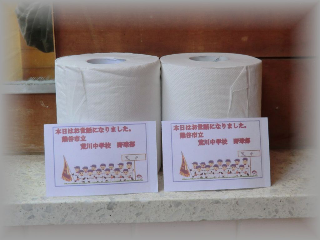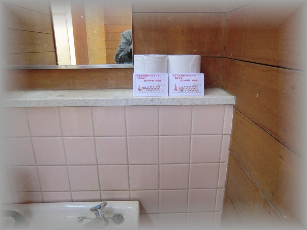ゴールデン・ウィーク中も川本中のグラウンドや体育館では、ほぼ毎日のように生徒たちが部活動で汗を流し、また、練習試合で大きな歓声が響いていました。今朝、グラウンドをまわっていたときの光景です。外トイレに、このような心配りがありました。野球部顧問に確認したところ、5月3日(金)に熊谷市立荒川中学校と練習試合を行ったとのことでした。すばらしい心配りと温かい感謝の気持ちが伝わってくる光景でした。熊谷市立荒川中学校野球部の皆さん大変ありがとうございました。