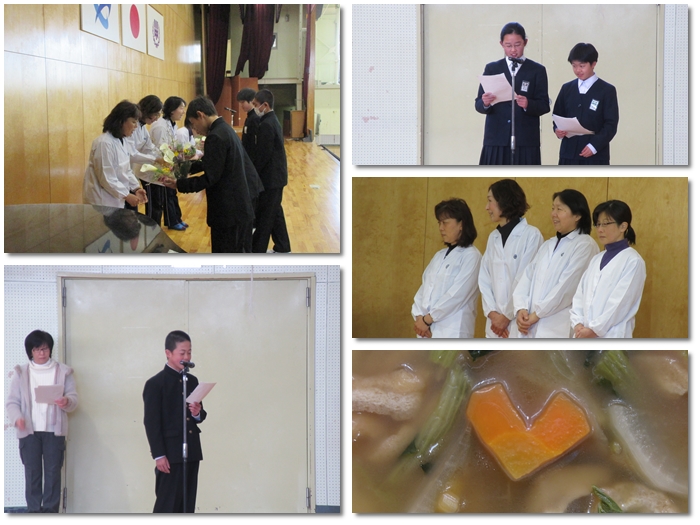 先週、給食集会が行われ、調理員の皆さんにお礼を伝えました。毎日、美味しい給食を作っていただきありがとうございます!また、みなさんの笑顔のために、様々な工夫を凝らしてくれています。3年生は明日で最後の給食となります。味わって食べましょう。