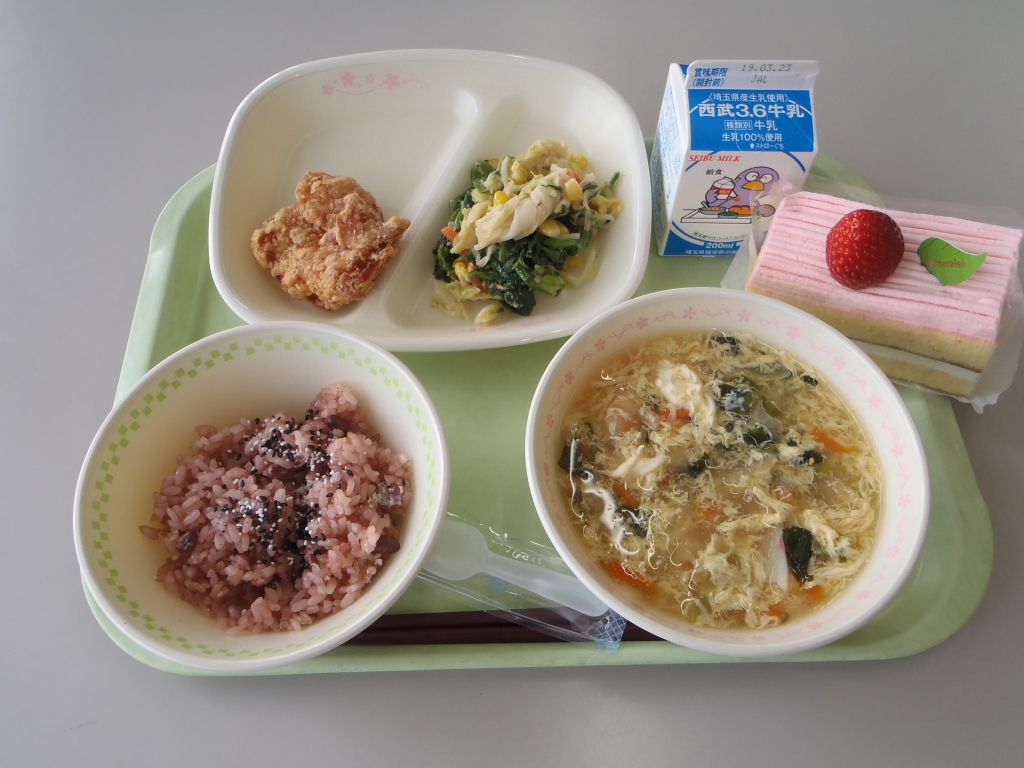今日は、3年生最後の給食ということでお赤飯とケーキでお祝い献立です。