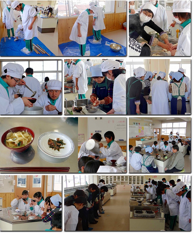 本日1・2時間目は1年3組の煮ぼうとうの調理実習でした。麺を打つところから始め、全て手作りの煮ぼうとう。学校応援団の方々に作り方を指導していただき、味も見た目もバツグンのおいしい煮ぼうとうができました。