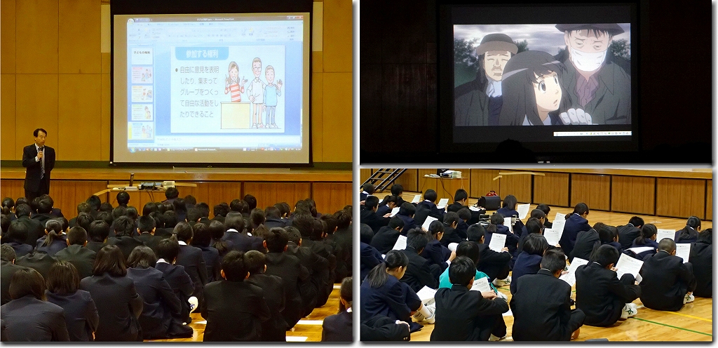 本日1時間目に拉致問題についてのビデオ『めぐみ』を題材に人権集会が行われました。その後、教室に戻りそれぞれの感想を書き、ひとりひとりが人権について考えました。